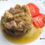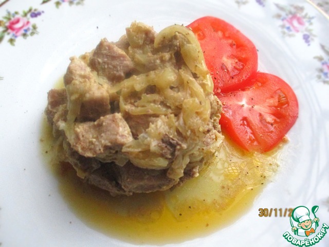 Быстро, просто, а главное вкусно! В детстве нас с братом часто оставляли у бабушки, и в один прекрасный день мы с ним очень сильно поругались. После тщательного расследования бабушка решила что виноваты мы оба и придумала для нас "полезное" наказание. Она заставила нас резать лук, которого было в тот год очень много. Нашинковав примерно с килограмм и вылив по тазику слез мы помирились, а бабуля сжалилась и стала думать что же сделать с нашими заготовками... Так в нашей семье появилось это блюдо. Мясо получается мягким, сочным, а лук придает пикантную нотку. И главное подходит к любому гарниру!