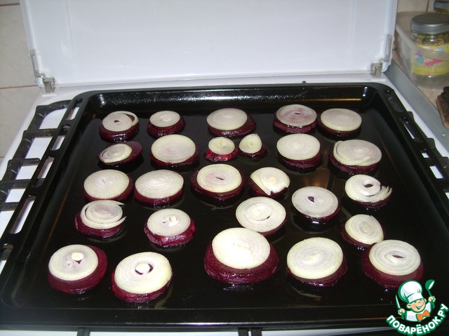 На смазанный растительным маслом противень выкладываем свекольные колечки. Пока мы возились со свеклой - духовка нагрелась. Отправляем туда противень на 15 мин. Пока свекла запекается - мы продолжаем.