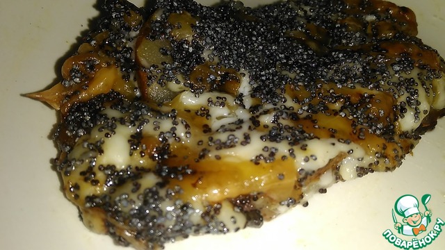 Лист смазываем маслом, выкладываем мясо, кладем сверху грушу, засыпаем всё сыром, делаем майонезную сеточку и обильно всё засыпаем маком.