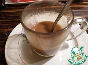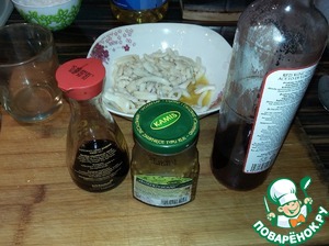 Образовавшийся от жарки кальмаров сок, сливаем в стакан. Добавляем соевый соус, уксус, горчицу и хорошо все перемешиваем. Получаем вот такую красивую заправку.
