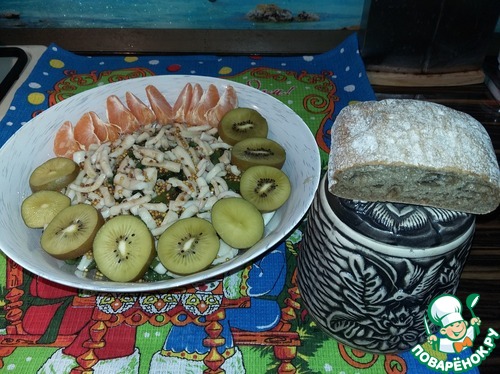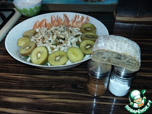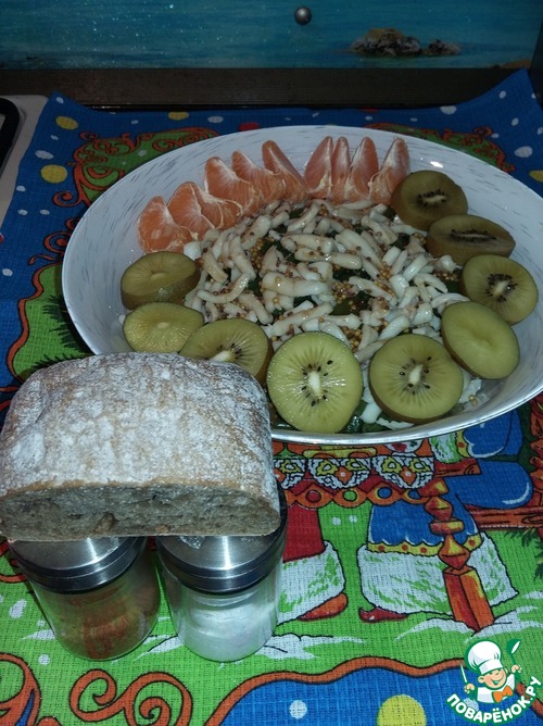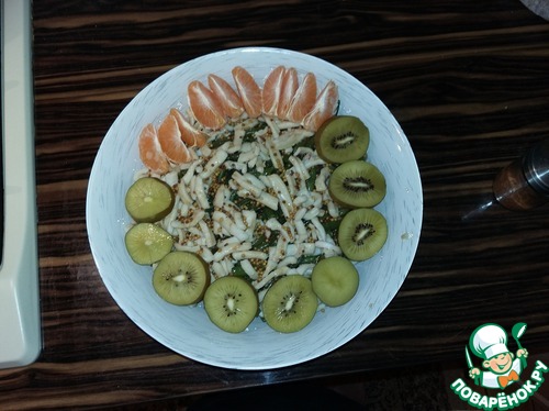 Берём киви и мандарин и украшаем наш салат. Ну а после этого накрываем его крышкой и отправляем в холодильник часов на 10-12. Ну или на ночь.