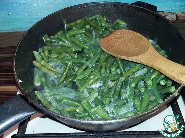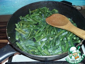 Тем временем во второй сковороде обжариваем фасоль до мягкости, примерно минут 10, постоянно помешивая.