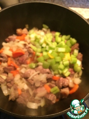 К мясу добавить поочерёдно лук, морковь, сельдерей, каждый раз по паре минут обжаривая всё вместе на среднем огне.