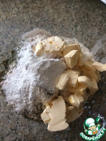 перец, пряности. Масло нарезать небольшими кусочками, добавить к муке. -
