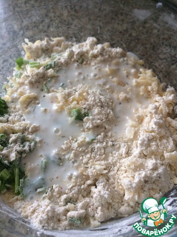 Сыр и лук добавить к муке.