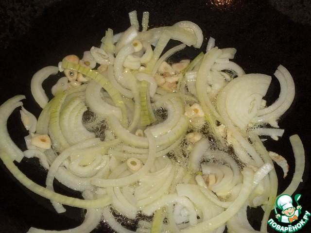 В казан нальем 4-5 ст. л. оливкового масла и хорошенько разогреем. Обжарим лук с чесноком на среднем огне «до стекла» (около 3х мин)...
