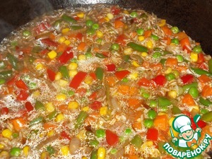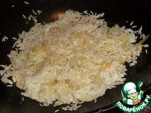 Всыпаем рис и обжариваем около 2х минут. Будьте осторожны – рис впитает в себя жидкость и через пару минут начинает прилипать к днищу. Если в казане совсем уж «сухо» - влейте еще немного масла...