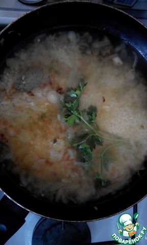 • Затем добавим к нему тщательно промытый рис, бульон, лавровый лист, веточку петрушки, накроем крышкой и оставим до выкипания бульона