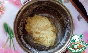 Затем добавляем к картофелю 2 яйца, соль, сахар (по вкусу), перемешиваем и добавляем муки, чтобы у нас получилось тесто.