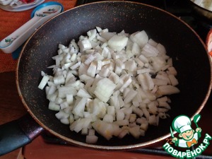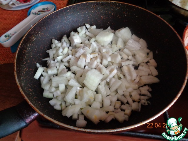 Лук мелко шинкуем и тушим в сковороде с растительным маслом на среднем огне под крышкой, пока он не станет менять цвет, при этом оставаясь мягким и сочным. Немного подсолить.