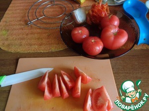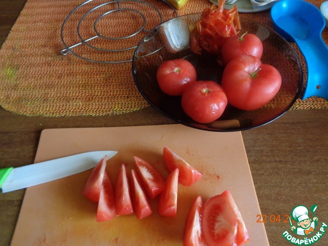 Помидоры ошпариваем кипятком и снимаем кожицу. Если помидоры крупные, то нарезаем их дольками, а если мелкие, то разрезаем пополам.