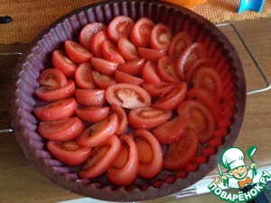 Форму смазываем маслом и выкладываем помидоры, слегка присаливая их и посыпая перцем.