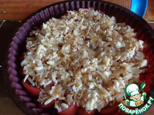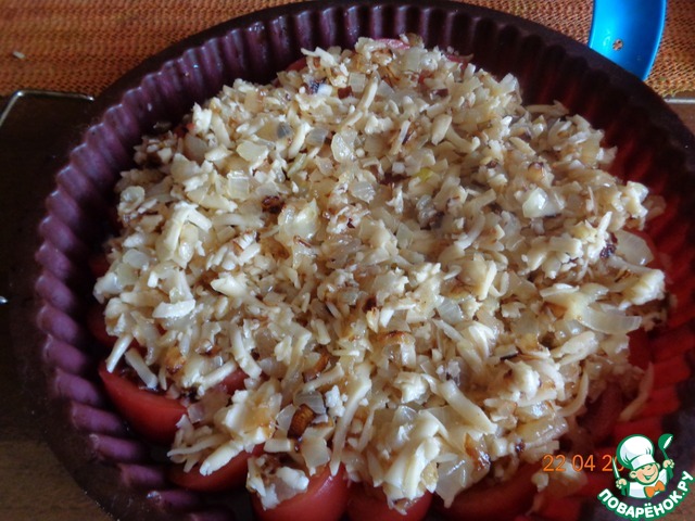 Лук смешать с тертым сыром и выложить поверх помидоров, уплотнив ложкой.