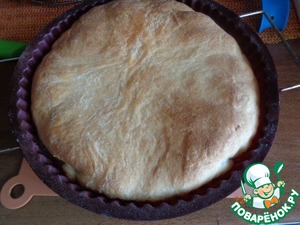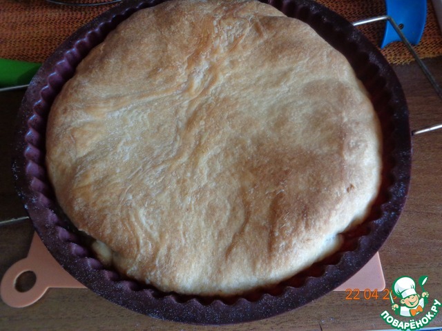 Готовый пирог переворачиваем на блюдо и в теплом виде подаем к столу вместе с бульоном или чаем.