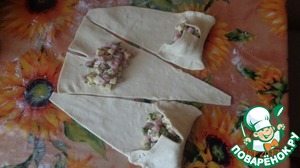 Тесто раскатываем на посыпанной мукой доске в пласт размером 45 х 25 см. Разрежем на треугольники с очень длинными боковыми сторонами и сделать небольшой разрез, как показано на фото.