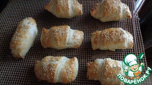 Противень смазать водой, уложить рогалики, смазать верх желтком и дать 5 минут постоять. Можно посыпать кунжутом.