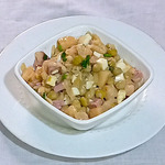 Картофель с яйцом сварились. Нарезаем их тоже кубиками и добавляем в емкость. Заливаем маслом, добавляем соль и перец, перемешиваем.