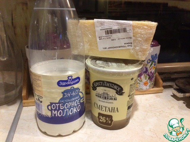 12. Смешиваем молоко и сметану и слегка солим. Каждый может взять по-своему количество молока и сметаны либо сливки. Я люблю слегка жидковатый соус, а сегодня у меня была ооочень густая сметана и пришлось ее разбавлять сильно. -