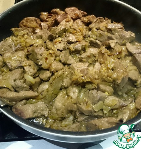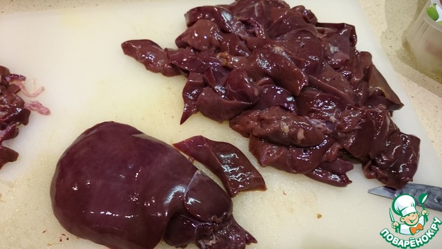 Возни с ней меньше чем с куриной, она крупнее, а принцип разделки такой же. Моем, удаляем все лишнее, и режем на дольки. И не забываем помешивать лук, ибо если подгорит, паштет будет горчить! -