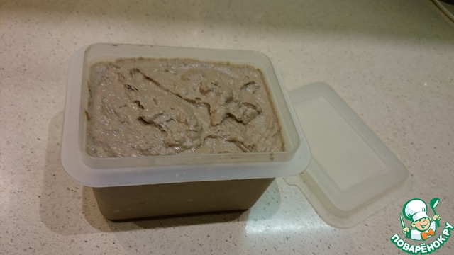 Когда масса становится однородной, выкладываем в посуду, в которой он будет храниться (у меня пластиковый контейнер ), плотно утрамбовывая, и ставим в холодильник, через несколько часов паштет готов к употреблению -