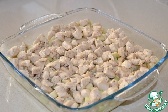 Выкладываем кусочки куриного филе на кубики баклажан в форму. -