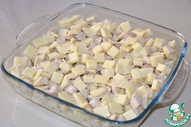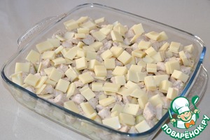 Нарезаем твердый сыр кубиками и выкладываем в форму сверху на мясо.
