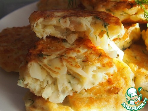 • У меня осталось немного капусты и чтобы как-то ее пристроить, я вылила в нее остатки яйца с молоком, добавила еще одно яйцо, ложку картофельного пюре, размоченную в воде черствую булку и немного муки. На сковороде раскалила подсолнечное масло, мокрыми руками сформировала лепешечки и обжарила их.