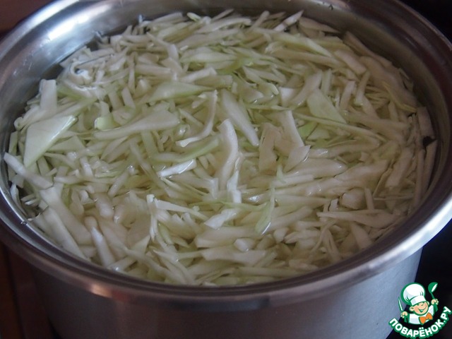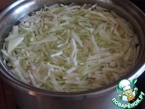 Капусту нашинковать и отварить в подсоленной воде почти до готовности, она должна остаться немного хусткой. Готовую капусту откинуть на дуршлаг и остудить холодной водой. Отварить вкрутую 3 яйца.