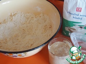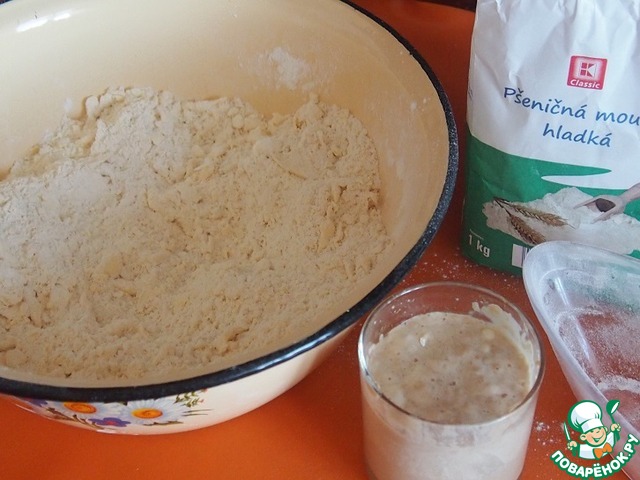 • Пока варится капуста замесить тесто. В 150 мл теплой воды растворить соль и сахар, добавить дрожжи и ложку муки, размешать. Из муки и масла сделать пальцами крошку, добавить подошедшие дрожжи и замесить тесто.