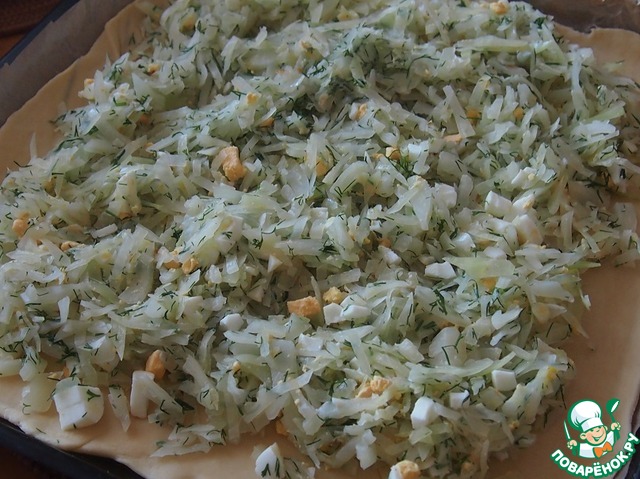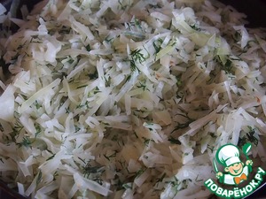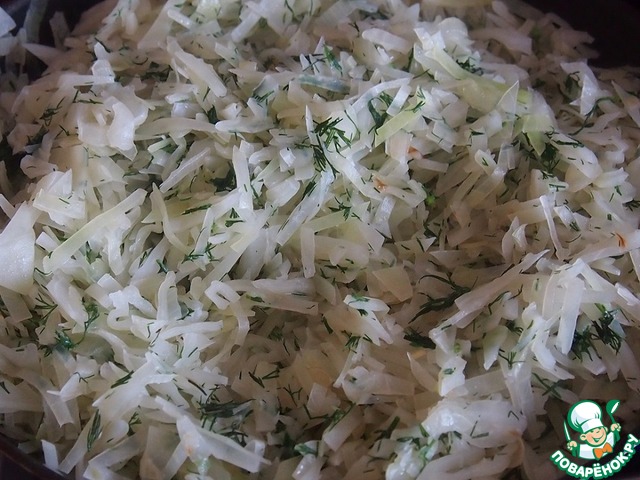 Пока тесто подходит, обжарить на подсолнечном масле мелко порезанный лук. Затем добавить капусту (лишнюю воду отжать, но не до фанатизма) и выложить на сковороду к луку, перемешать и потушить примерно 10 минут. Затем к капусту добавить мелко порезанный укроп.
