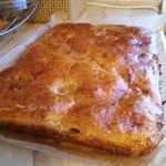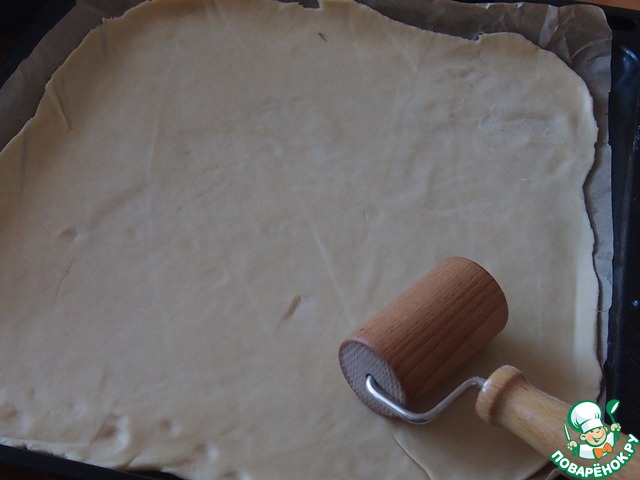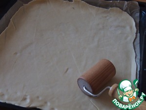 Тесто (оно не особо увеличится, но станет очень приятным и пластичным) разделить на две части. Из одной половины раскатать пласт размером в противень, застеленный бумагой для выпечки.