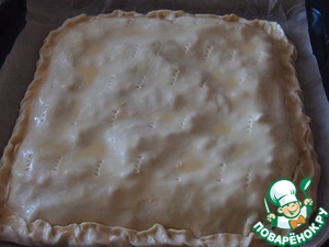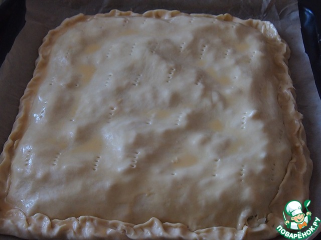 Раскатать в пласт другую половину теста и накрыть им пирог, по периметру слепить нижний и верхний пласты теста, сделав кантик. Сырое яйцо взбить вилкой, добавить ложку молока и смазать пирог, вилкой сделать проколы в верхнем слое теста.
