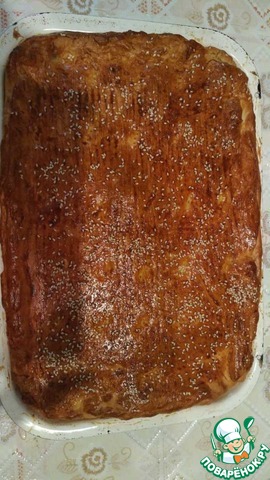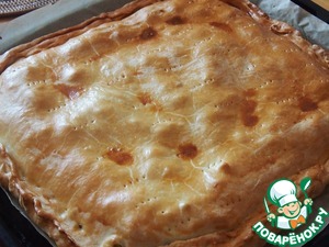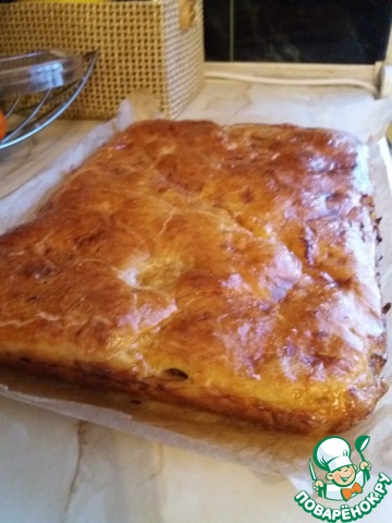 Печь пирог в разогретой духовке при температуре 200 градусов до золотистого цвета (примерно 25-30 минут). Готовность теста проверить спичкой. Готовый пирог немного сбрызнуть водой, накрыть полотенцем и оставить отдыхать на 10-15 минут, затем полотенце снять. Можно звать гостей к столу!