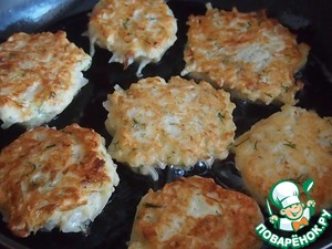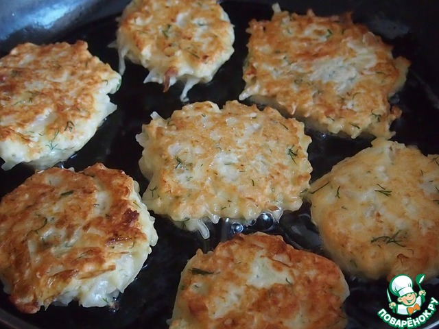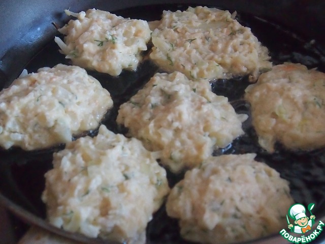 У меня осталось немного капусты и чтобы как-то ее пристроить, я вылила в нее остатки яйца с молоком, добавила еще одно яйцо, ложку картофельного пюре, размоченную в воде черствую булку и немного муки. На сковороде раскалила подсолнечное масло, мокрыми руками сформировала лепешечки и обжарила их.