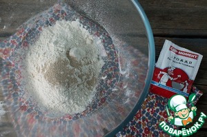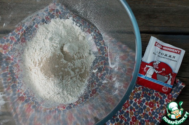 В миску просейте 115 г муки (от общего объема) и добавите 1 ч. л. дрожжей. Перемешайте.