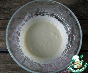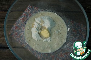 • В миску с мукой и дрожжами добавьте молочную сыворотку и сливочное масло. Все хорошо взбить, лучше миксером, до образования однородной массы.