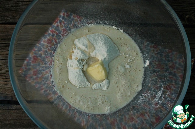 В миску с мукой и дрожжами добавьте молочную сыворотку и сливочное масло. Все хорошо взбить, лучше миксером, до образования однородной массы.