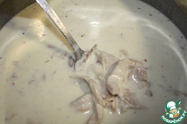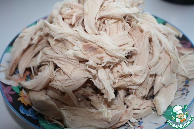 Затем вытащить курицу и разобрать мясо на кусочки. -