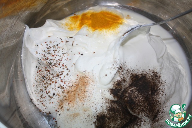 Смешать йогурт с куркумой, перцем красным и черным, солью. Все хорошо перемешать и поставить кастрюлю на огонь.