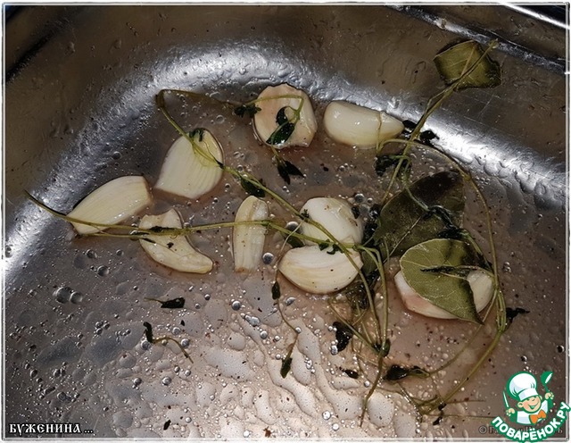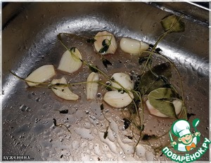В поддон нарезать чеснок. Не надо рубить мелко, вот такими пластинами лучше всего. Добавить ветку, максимум две тимьяна. Пару лавровых листиков. Несколько горошин душистого перца раздавить. Именно – просто раздавить. Ну и … если есть какие-то фантазии на тему еще каких любимый специй, не надо себе отказывать, хотя и переборщить – тоже нехорошо.