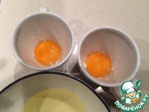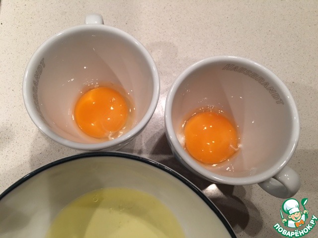 • Возьмите яйца и разделите на белки и желтки. Оба белка в плошку, желтки в разные чашечки ( плошки), как Вам удобно.