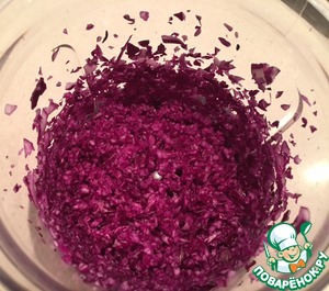• Тем временем, возьмите небольшой кусочек капусты и измельчите в блендере. В итоге нам нужен только сок. Я отжала его через марлю.