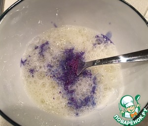 • Возьмите сок (или отжимайте непосредственно в белки). Количество капустного сока скажется на интенсивности цвета. Я далее покажу разные фото. Можно добавить чайную ложку и будет нежный цвет, как у воздушного облачка. Можно добавить пару ложечек!
