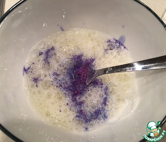 Возьмите сок (или отжимайте непосредственно в белки). Количество капустного сока скажется на интенсивности цвета. Я далее покажу разные фото. Можно добавить чайную ложку и будет нежный цвет, как у воздушного облачка. Можно добавить пару ложечек!