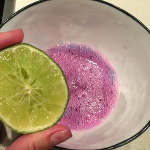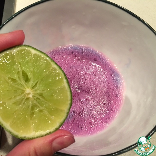 • Следом, в оставшиеся белки выдавите чайную ложку сока лайма или лимона и перемешайте! Волшебство! А для детей просто фокус!