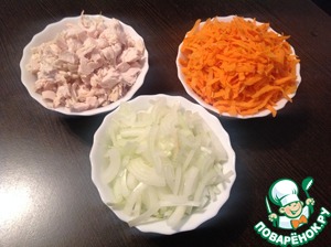 Куриную грудку нарезать кусочками. Морковь помыть, почистить, натереть на крупной тёрке. Лук почистить и нарезать соломкой.