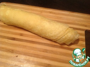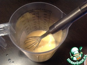 Приготовить блинчики. Яйца взбить с солью. Крахмал смешать с водой, влить в яйца, взбить.