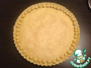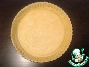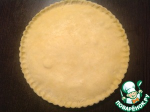 Диск большего размера раскатать в тонкий пласт, выложить в форму диаметром 23 см. Лишнее тесто срезать ножом.