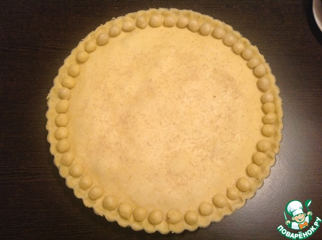 Из остатков теста скатать маленькие шарики и выложить их по краю пирога. Посыпать пирог сверху оставшимся сахаром. Выпекать в разогретой до 220 С духовке 20 минут. Затем температуру снизить до 190 С и печь ещё 1 час.