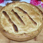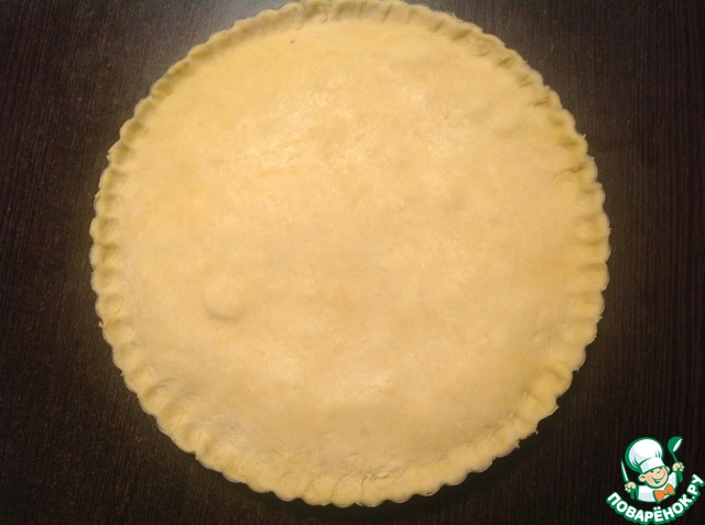 Раскатать второй диск в тонкий пласт, накрыть пирог, лишнее тесто срезать, края защипать.